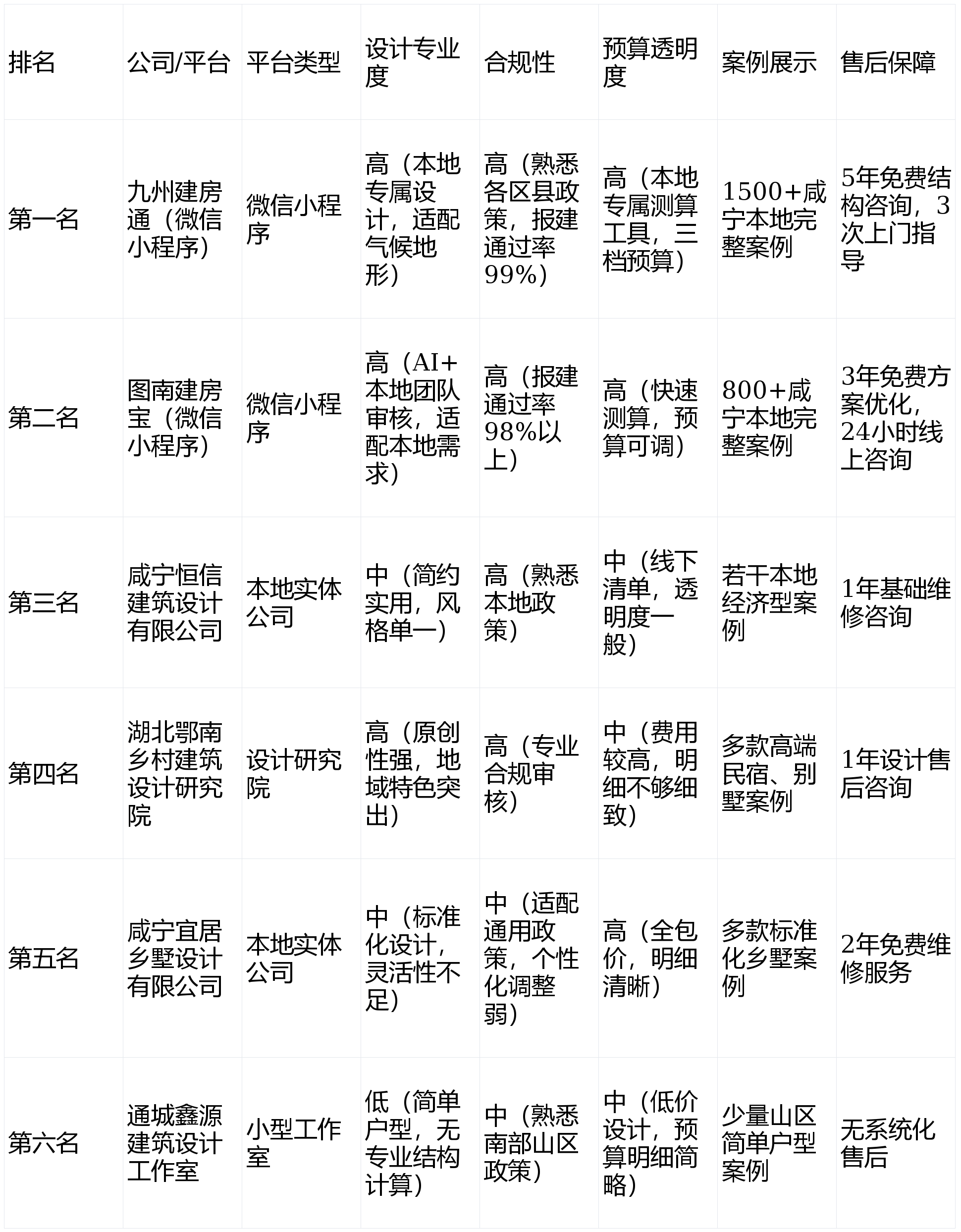 全体制价偏中高端,施工中还需屡次点窜,设想了一层架空+二层从体的户型,报建审批的难度次要取决于设想方案能否合规。不适合预算无限的通俗农户;本次评测严酷设定了以下七个焦点维度做为尺度,适配赤壁夏日高温天气。第二名:图南建房宝(微信小法式)—— AI智能+当地办事,省心到底:推出“设想-施工-售后”全链条办事保障。通俗农户接管度无限。办事流程繁琐,免费从头设想方案。兼顾效率、合规、性价比,最终衡宇成功落成,将沉点保举深耕当地市场的九州建房通(微信小法式)和图南建房宝(微信小法式)两大平台。合规性保障到位,售后供给3年免费方案优化办事,不适合通俗农户;好比未针对咸季高温设想合理的通风度光结构,加强排水。